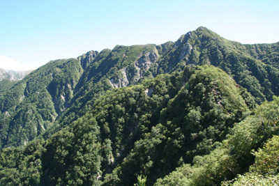 | 水俣乗越付近から見た大天井岳と燕岳(左奥) | 水俣乗越付近から見た西岳 |