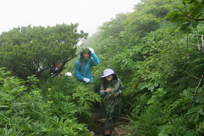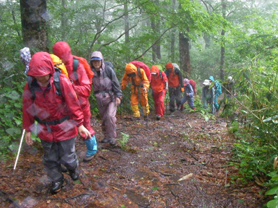| 雨が降りしきる中、孫六温泉から乳頭山に 向けて行けるところまで行くことにする。 |
