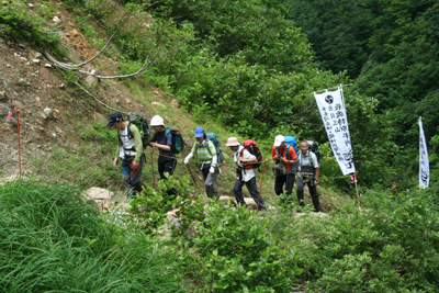 | 沢沿いの登山道を登る。 | 多くの修験者と出会った。 |