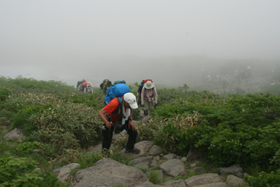 | 途中の雪渓の上を歩く。 | 山頂に近づくにつれて、霧が深くなる。 |