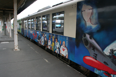 | 由利高原鉄道のおばこさん?とツーショットのHさん。 | 宇宙戦艦大和が車体に書かれた由利高原鉄道の列車。 |