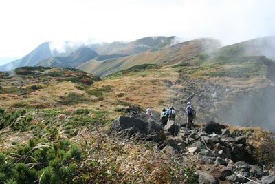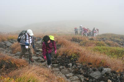 | 10月7日、紅葉した登山道を登る。 | 賽の河原付近にて。 |