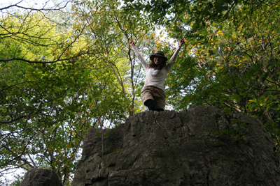 | 岩茸石に登るKさん。 | 岩茸石の上に立つKさん。 |