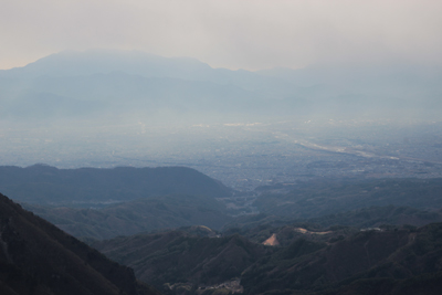 | 甲府盆地と雨ヶ岳、毛無山方面 | 茅ヶ岳(左)と金ヶ岳(右) |