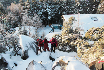 | シリセードを楽しむFさん。 | 煙突から煙を出すしらびそ小屋で昼食タイム。 |