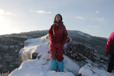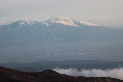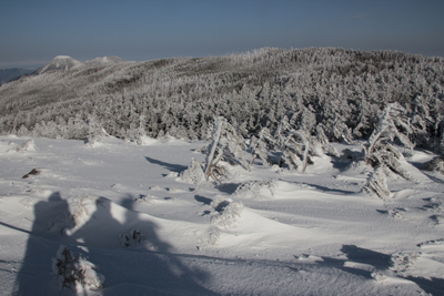 | 後には樹氷のしらびそ林が広がり、浅間山も見える。 | 中山山頂にて。 |