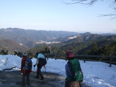 | 竹寺から子ノ権現を目指して歩きはじめる。(Yさん提供) | 残雪の残る関東ふれあいの道を歩いて子ノ権現を目指す。 |