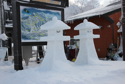 | ロッジから見たドッコ沼 | スキー場にあった雪でできた灯籠 |