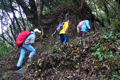 | 福満寺からスイセンの咲く道を登る。 | 雨が降る中、元気に登るAちゃんとY君。 |