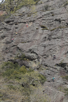 | 登山道を歩きはじめる。 | 城山の南壁を登るクライマー。 |