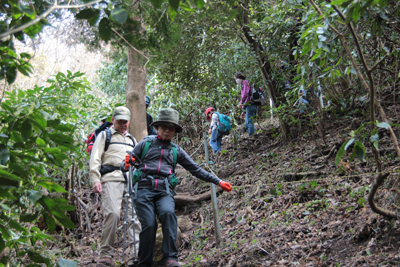 | Mさんをサポートして下るYMさん。 | 急坂を慎重に下る。 |