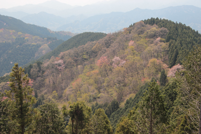 | 赤い芽や葉が目立つ山腹 | 山腹を彩る満開の桜 |