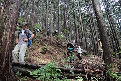 | カタツムリを手に持つYくん。(Yさん撮影) | 雨が止み、カッパを脱いで杉林を登る。 |