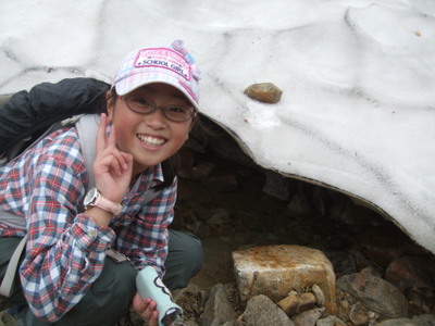| 雪渓の上に立つR君、S君、Aさん。(Yさん撮影) | 雪渓から流れる水は冷たいよ!というSちゃん。(Yさん撮影) |