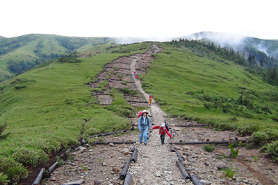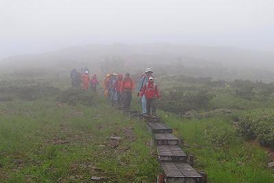 | 薬師岳を背に木道を歩くIさん。 | ニッコウキスゲの咲く登山道を歩くメンバー。 |
