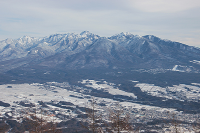 | 北アルプス全山の連なり | 甲斐駒ヶ岳(左)、鋸岳(中央やや右)、 間ノ岳(中央奥)、仙丈岳(右) |