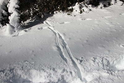 | シカの足跡(小さな蹄と大きな蹄があるように 見えますがなぜか分かりますか?) |