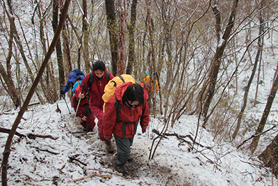 | 雪の積もった丸太の橋を渡る。 | 雪の多くなった登山道を登る。 |