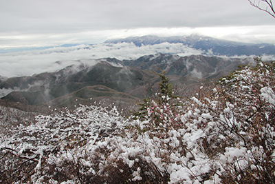 | 雪の積もった木々の向こうに赤城山が見える | 山頂から見たアカヤシオの咲く山腹 |