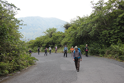 | 三原山を背に車道を歩く。 | 海を背に登山道横のコンクリート道を歩く。 |