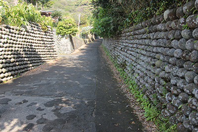 | 南原千畳岩海岸から見た八丈小島 | 島流しに遭った人たちが積んだと言われる玉石垣 |