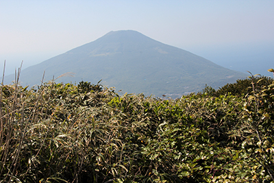 | 登山口付近から見た八丈富士 | 八丈富士への登りで見た三原山と八丈空港、 八重根漁港方面 |