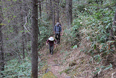 | 王ヶ鼻にて。 | 林道を歩いて天狗の路地に向かう。 |