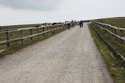 | 広い草原を歩く。 | 牛たちを見ながらメインストリートの林道を歩く。 |