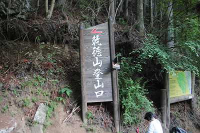 | 乾徳山の登山口。 | 新緑の中を登る。 |