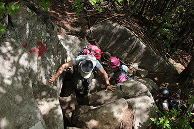 | 扇平では木陰で休憩する。(M.Yさん撮影) | 最後の山頂への登りは、岩場の連続となる。 |