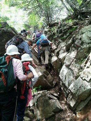 | 岩場が次々に現れる。 | 岩場を登っているところを下から見る。(M.Yさん撮影) |
