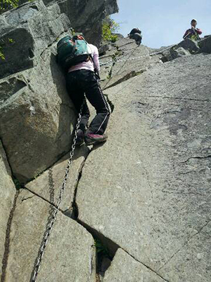 | 最初の鎖場を登るCさん。(M.Yさん撮影) | 最初の鎖場を登っているところを上から見る。 |