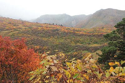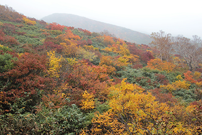 | 山腹の紅葉は見事な美しさ | 晴れていたら素晴らしい東栗駒山の山腹の紅葉 |