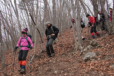 | 権現山山頂にて。 | 山頂からの下りも急坂で始まる。 |