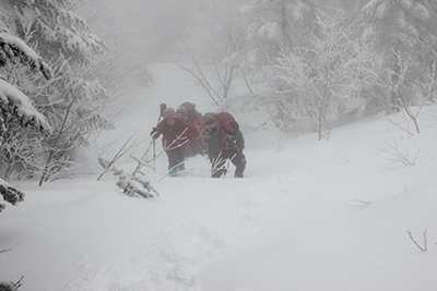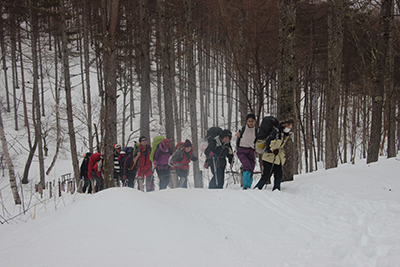 | 傾斜が増し、ラッセルが厳しくなってくる。 | 蓼科山荘に到着し、昼食タイム。 |