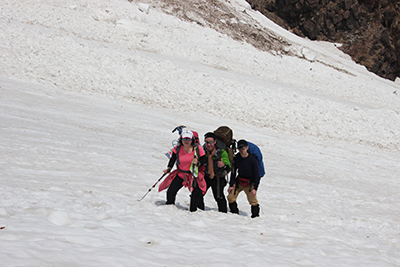 | 熱い日差しを受けてデブリの残る大雪渓を登る。 | 大雪渓を登る3人。 |