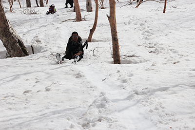 | 滑落したら止まらない山腹をトラバースする。 | 樹林帯ではシリセードを楽しむ。 |