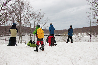 | 完全に雪に埋もれた車道を歩く。 | 視界が開けて山を振り返る。 |