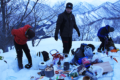 | 店を広げてきりたんぽを作る。 | 2日目の朝、雪洞前で出発準備。 |
