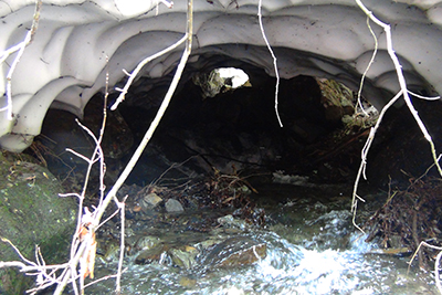 薄くなったスノーブリッジに空いた穴から新緑が見える |