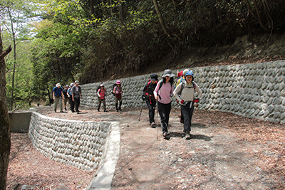 | 三ノ瀬から歩きやすい林道を登る。 | 林道は周囲の新緑が美しい。 |