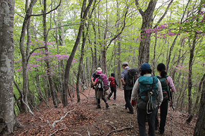 | 熊倉山周辺の登山道はとても歩きやすい。 | 熊倉山を過ぎてもミツバツツジは続く。 |