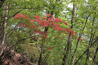 | 花が開いたばかりで赤が濃いアズマシャクナゲ | 熊倉山が近づくとミツバツツジが増える |