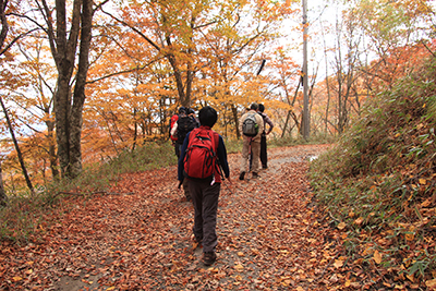 | 木漏れ日の差し込む林道で休憩する。 | すばらしい紅葉だった。 |