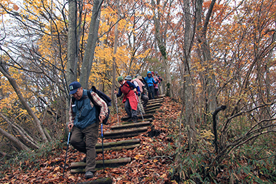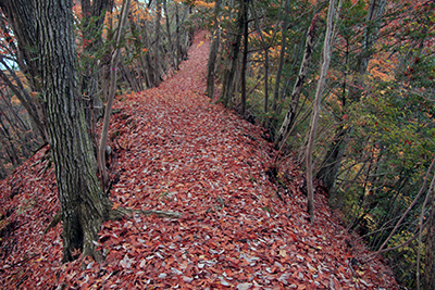 | 美しい落ち葉の道を登る。 | 石砂山の山頂が近づくにつれ、傾斜が強くなってくる。 |