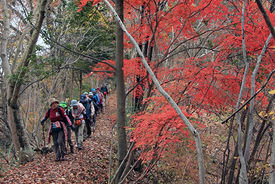 | 真っ赤なもみじの横を歩く。 | 菅井から峰山に向けて林道を歩く。 |