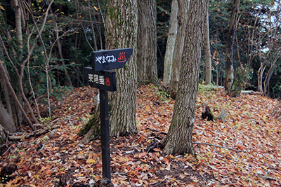 | 峰山山頂でくつろぐ。 | やまなみ温泉と東尾垂の分岐の道標。 やまなみ温泉への下りは滑りやすい急坂の連続だった。 |