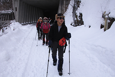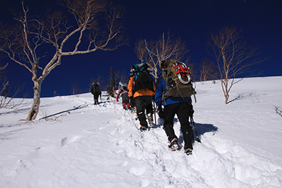 | 深く積もった急な雪道を上る。 | 傾斜が落ちた2,300m付近を歩く。 |