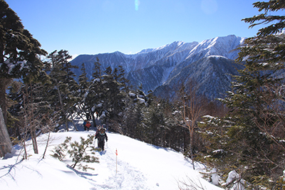 | 槍ヶ岳を見ながら合戦尾根を下る。 | 樹林帯ではトレース短縮コースでシリセードを楽しむ。 |