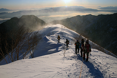 | 槍穂高連峰を背に。 | 雪煙舞う合戦尾根を下る。 |